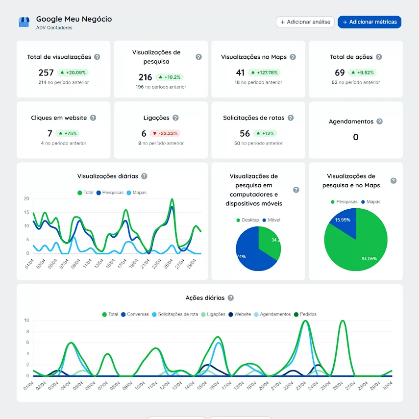 Não fique por fora de como seu perfil Google está performando! Com opção de relatórios semanais, conheça os detalhes da performance da sua empresa no Google.